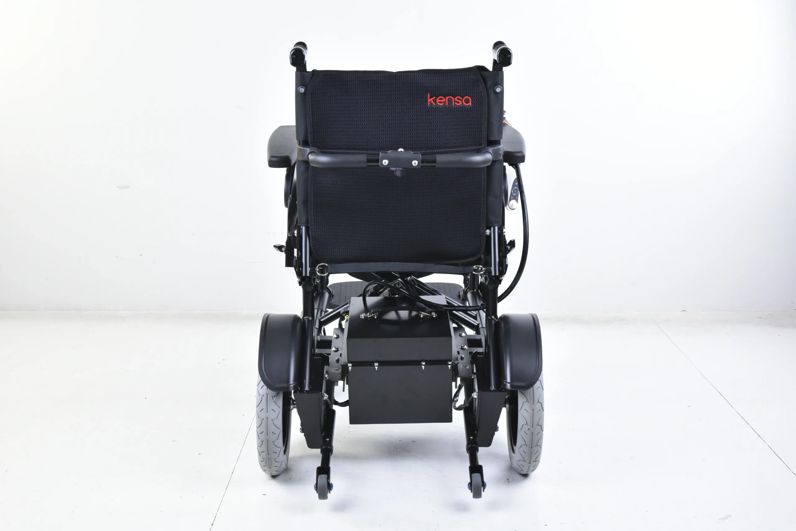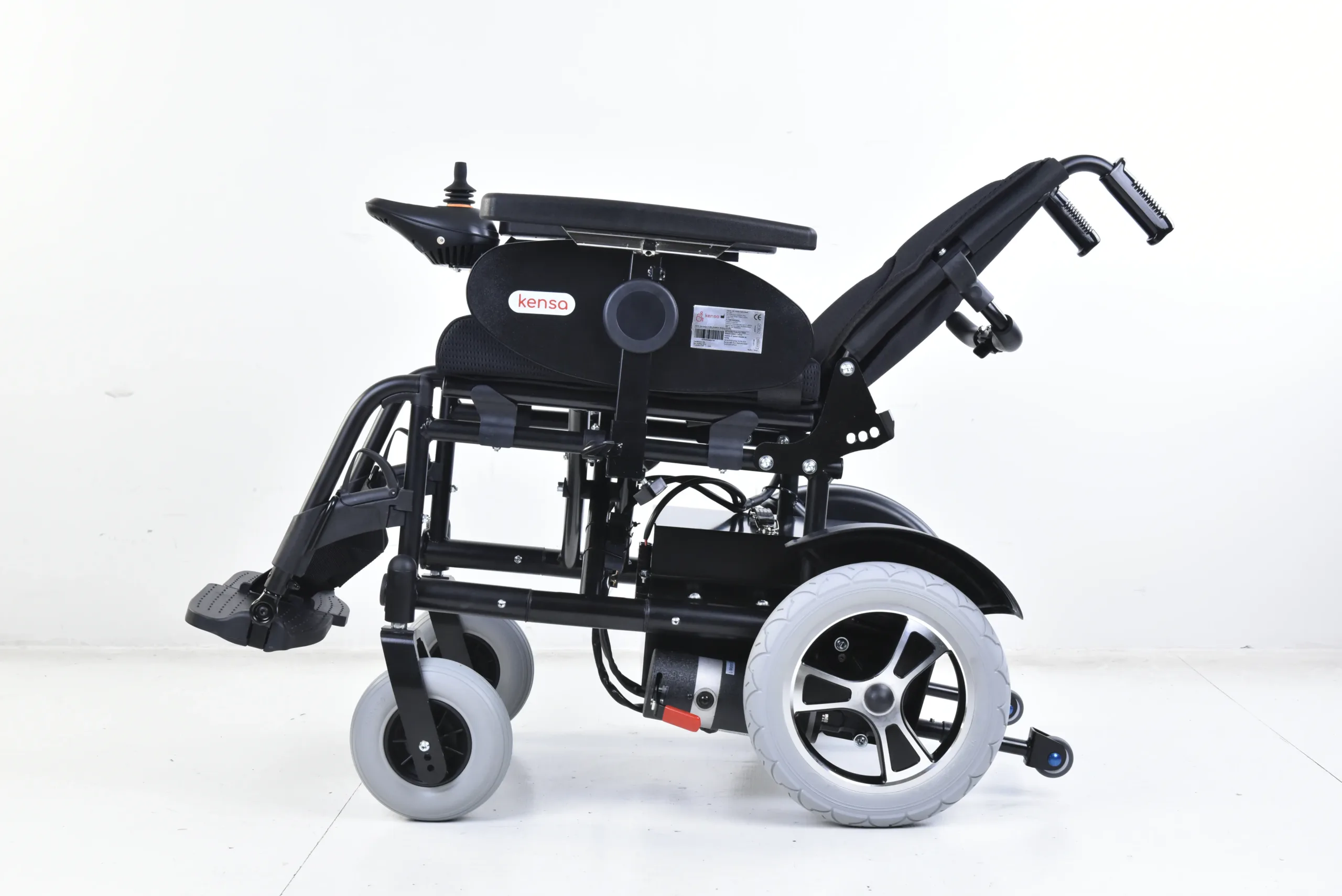 Kensa K-250 Akülü Tekerlekli Sandalye, 350 W çift motoru, yüksek kapasiteli 32 Ah jel aküsü ve manuel yatar sırtlık özelliğiyle üst seviye kullanıcı konforu sunar.