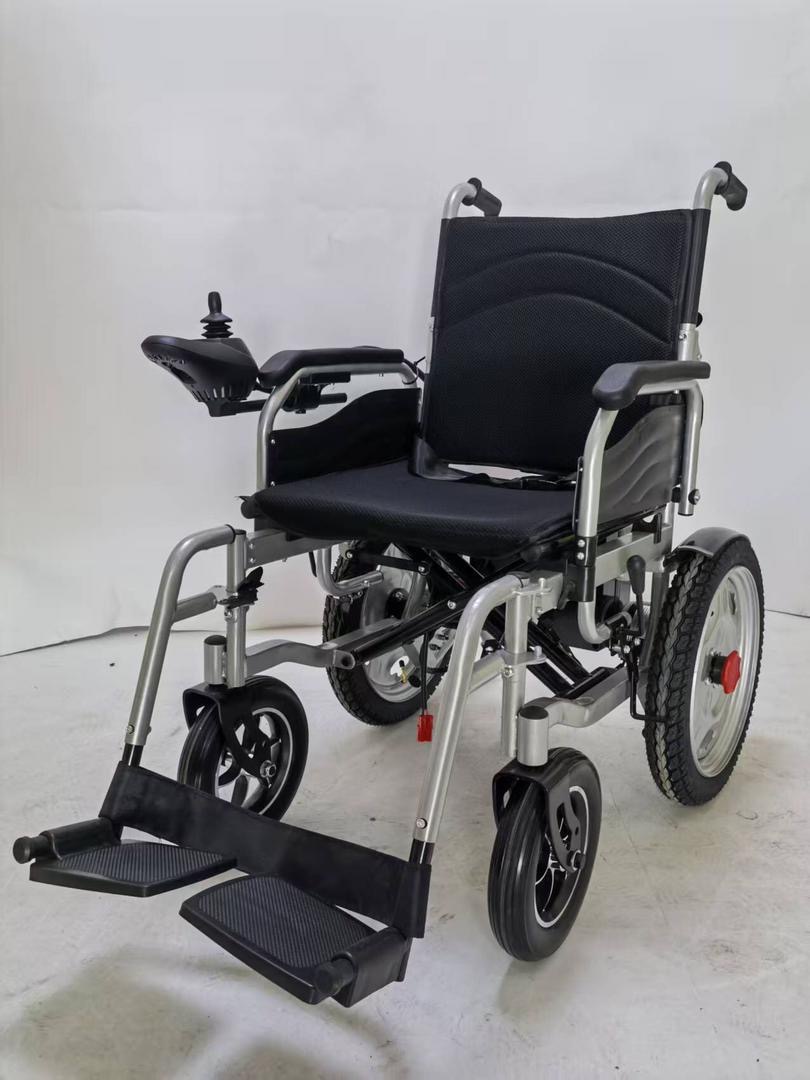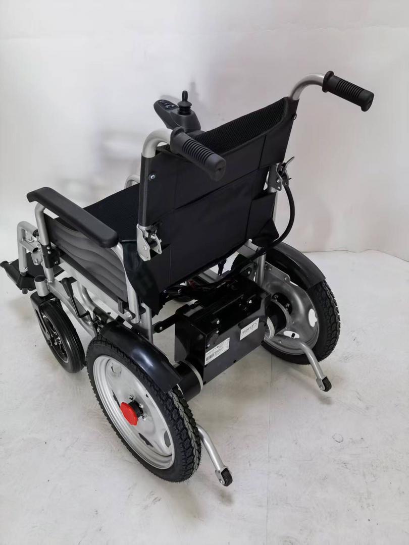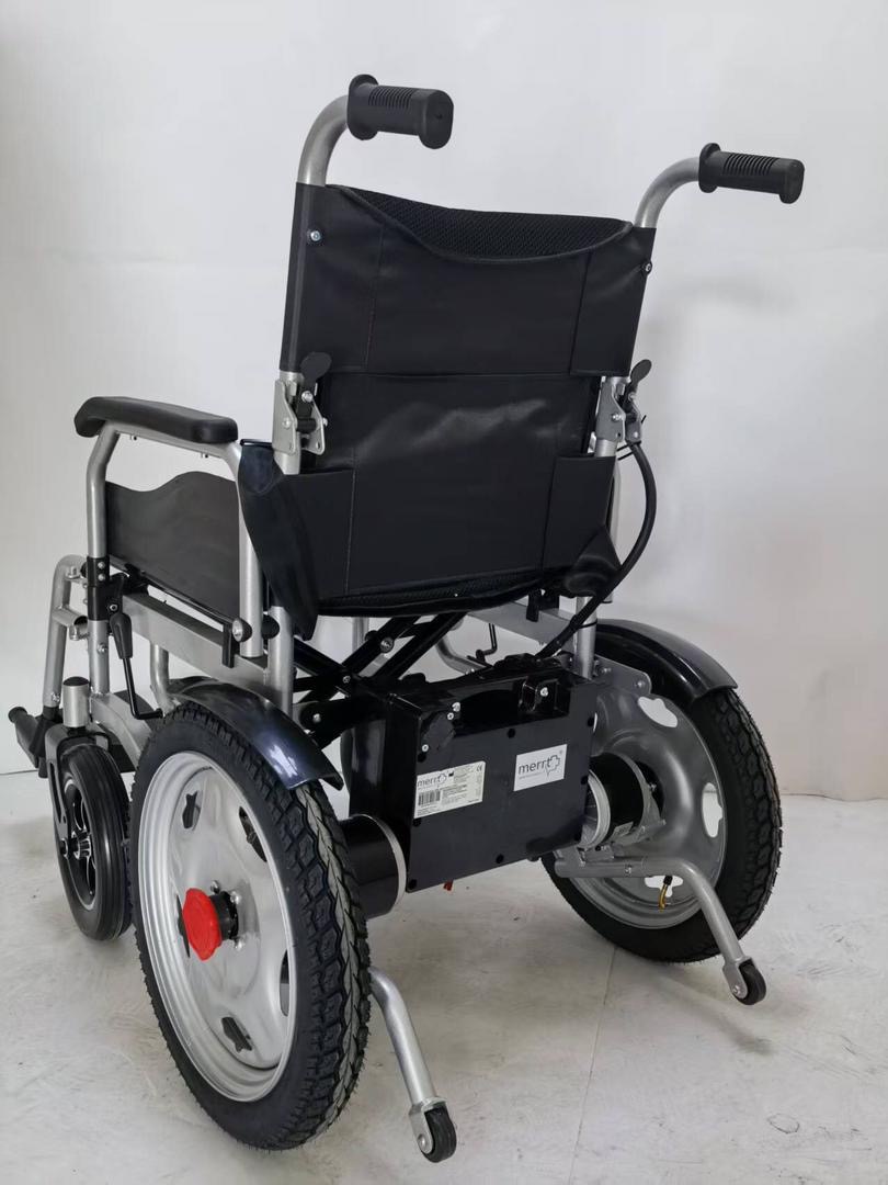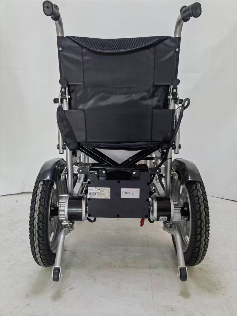 Merrt BME4646 Akülü Tekerlekli Sandalye, geniş 16” arka tekerlekleri ve sağlam çelik gövdesiyle yüksek denge ve güvenli sürüş sağlar.